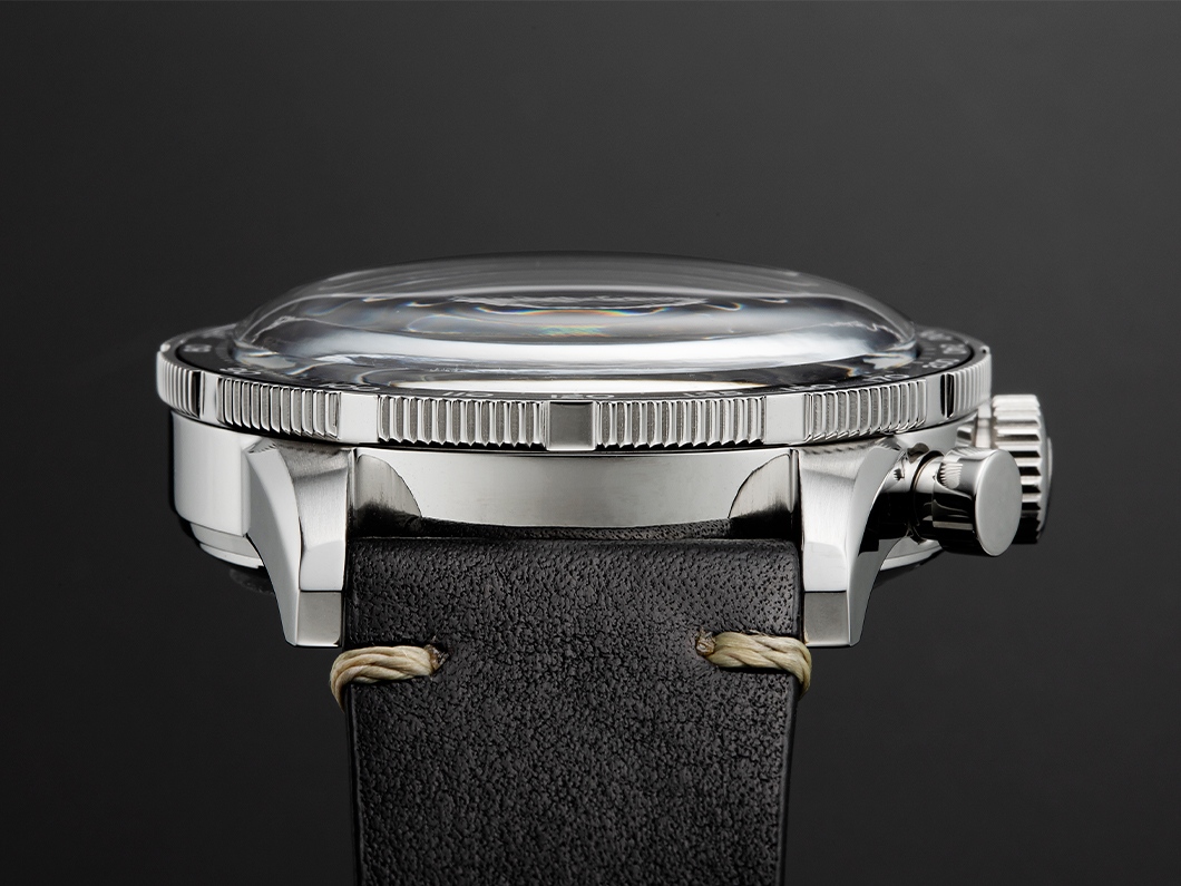 そのため開発時においてレトロ感を出すためにこだわったのがベゼルとインデックスだったのである。ベゼルはあえて傾斜を付けず平らに設計。そうすることで全体のフォルムがキレイにまとまりすぎず、逆にプラスチック風防のドーム形をキレイに見せることができた。加えてベゼルのタキメーター表示もアラビア数字は当時のように太くて丸いものを採用。それによって見た目の古っぽさを強調したのだ。
