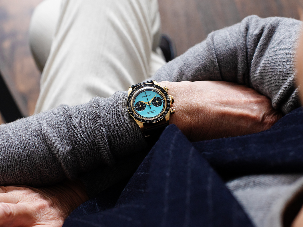 艶のないマットな質感のクリームイエローを文字盤に採用した2レジスタークロノ・レモンに対して、新作ターコイズは光沢感ある仕上げを採用することで、黒を基調とした雰囲気のなかにターコイズブルーが際立つクラシカルかつモダンなスタイルが大きな魅力となっている。