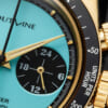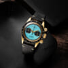 文字盤はラストシーンの夜空を映すグラデーションブルーに、希望の光が差し込むなか、天へと駆け上がるネロとパトラッシュが金色で浮かぶ。10時位置には風車小屋、5時半にミルク缶、7時半にアヒルのクロなど、作品を象徴するアイコンを配置した。