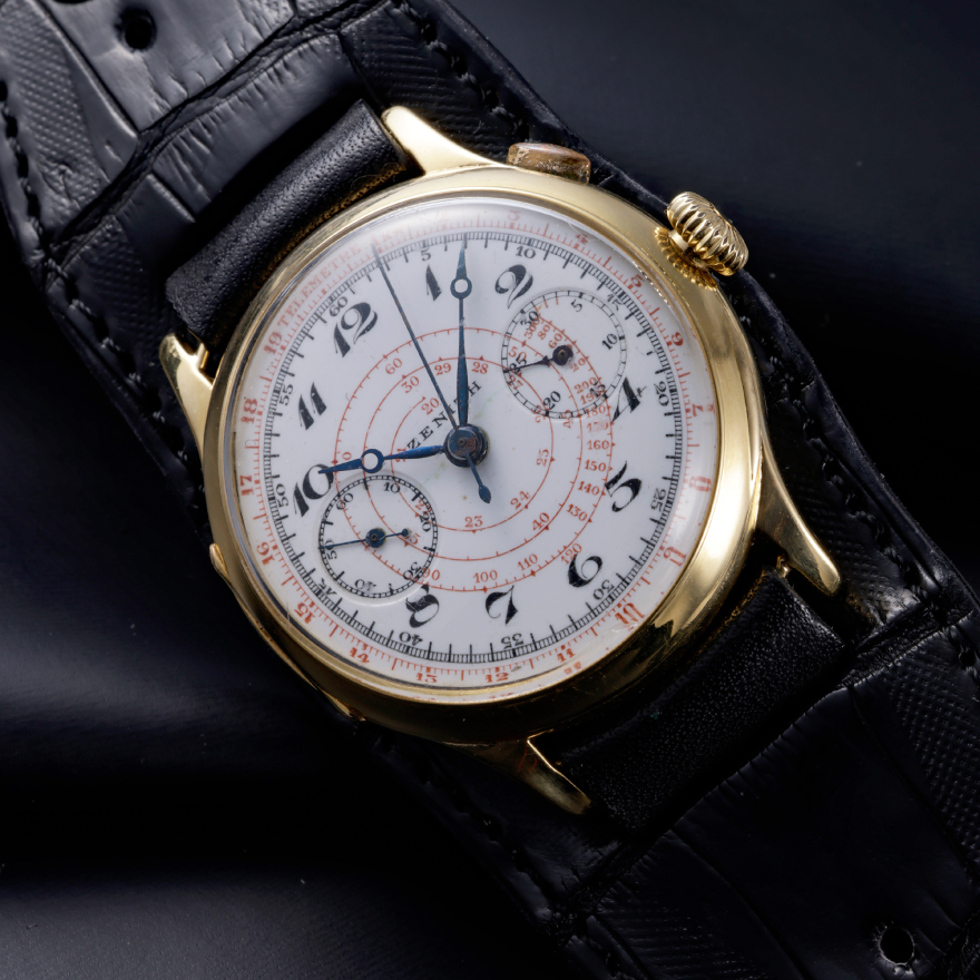 1920年代に初となる腕時計クロノグラフを生み出しているゼニス。この個体も最初期に製造されたモデルのひとつで、開閉式のハンターケース、ポーセリン文字盤など随所に懐中時計を彷彿とさせるディテールを備えている。搭載するのは、後にCal.22へと発展するバルジュー社製のキャリバー“GHT”だ。