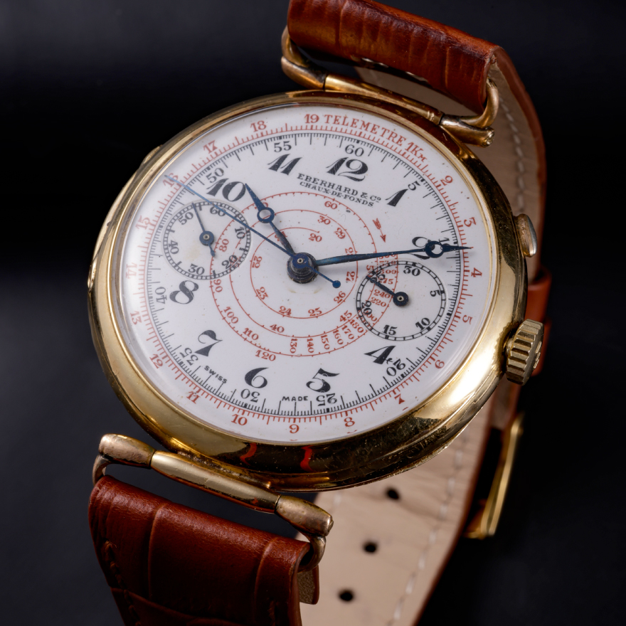 クロノグラフの巨匠と呼ばれるエベラール初のクロノグラフ(1919年発表)。40mm径の金無垢ケースにこちらも希少なポーセリン文字盤、可動式ラグをを採用、両サイドのラグを繋ぐ縦サイズは50mmを超える。公式HPでも絵でしか見られないほど現存数が少なく、時計史に残る伝説的モデルのひとつだ。