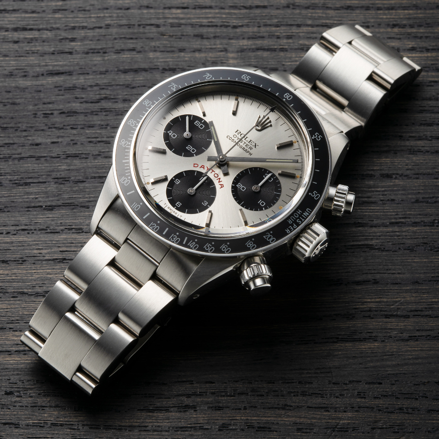 プッシャーがネジ込み式に改められ、気密性が向上したデイトナ第3世代のRef.6263。インデックスの夜光が部分的に欠損しているものの、当時のオリジナル“溝なし”プッシャーに加え、初期型文字盤に見られる“ビッグデイトナ”仕様となっているなど、ツウ好みなディテールを備える1本。
