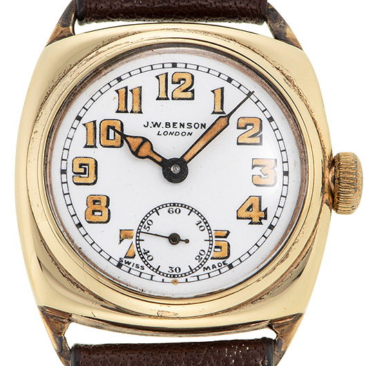 【写真の時計】J.W.ベンソン クッションケース。K9YG(30mm径)。手巻き。1930年代頃製。38万9850円。取り扱い店/かめ吉