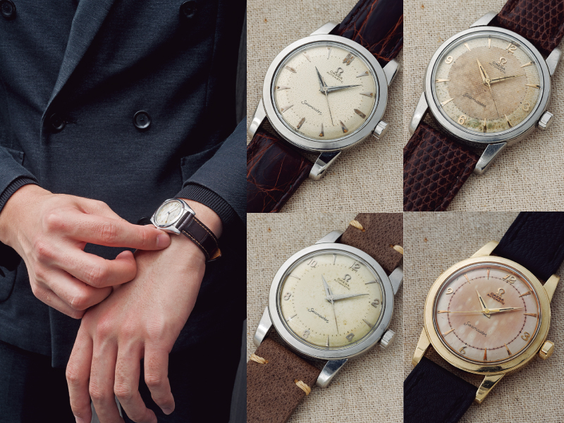 (左)現代の腕時計に比べて小振りなサイズ感なのもアンティークウオッチの魅力のひとつ/(右)文字盤の変色の仕方は個体によって千差万別だ(写真はすべてオメガ・シーマスターシリーズの経年変化)