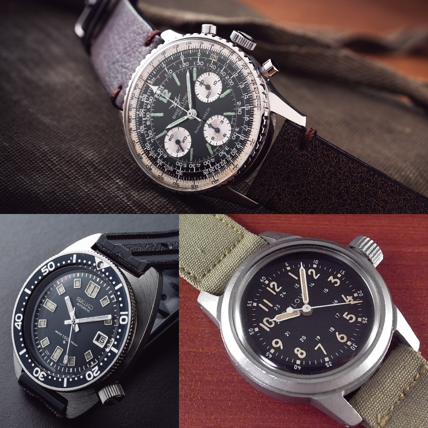 数あるジャンルのなかでも屈指の人気を誇るクロノグラフ(写真上)、ミリタリー(写真左下)、ダイバーズ(写真右下)