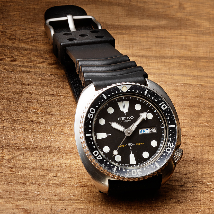 1976年頃から製造されたセイコー ダイバー 150Mの3rdモデル。丸みを帯びた形状から“タートル”の愛称で親しまれるケース内には、マットブラック文字盤と太めの時分針がセットされ、精悍な雰囲気になっている。自動巻き専用機として開発された毎時2万1600振動の“Cal.6306”の信頼性も高い。