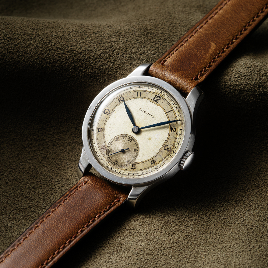 アンティークの傑作キャリバーのひとつに数えられる12.68Zを搭載した、1940年代製のロンジン。文字盤にやや劣化は見られるものの、アラビア数字インデックスに沿う2重サークルラインとツートンのアイボリー文字盤、そして美しいブルースチール針の組み合わせが、上品かつクラシックな印象に仕上がっている。