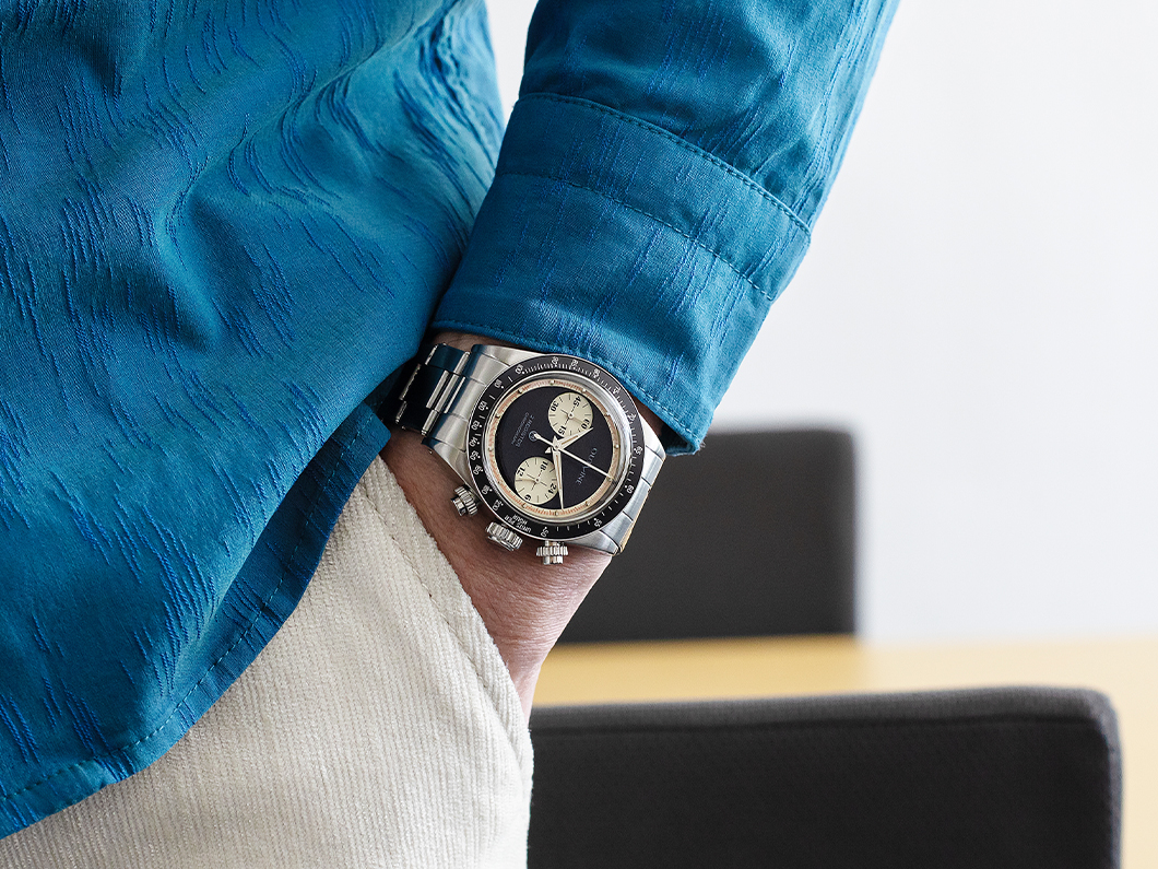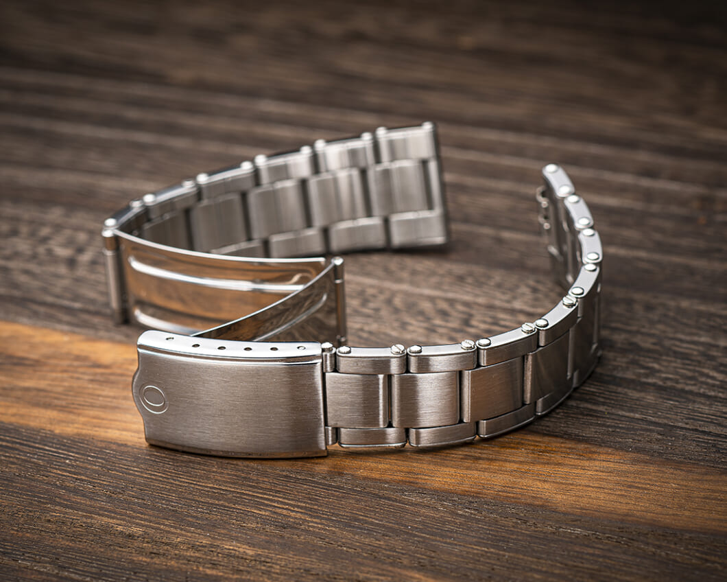 ロレックスが1950年代半ばから60年代半ばにかけてスポーツモデルなどに採用したものを忠実に再現するためにコマの一つひとつを当時のようにステンレスの板を折り曲げて製作するという、かなり手間のかかる作業で製作している。
