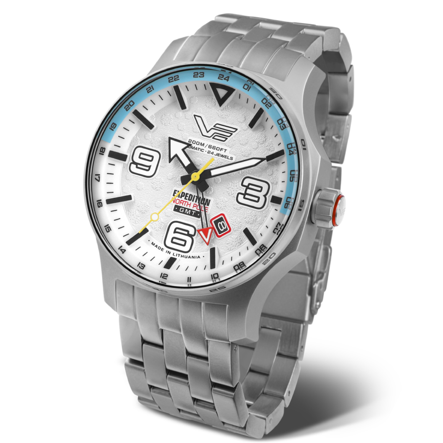 雪の結晶をモチーフにしたエンボス加工が施された真っ白な文字盤に加え、裏ブタには精緻な雪の結晶を刻印。青く発光するフルルミナス仕様の付属シリコンベルトに付け換えると、まるで氷と一体化するような幻想的な雰囲気に。機能面では、TMI NH34自動巻きGMTムーヴメントを搭載するほか、耐衝撃性に優れたK1クリスタルを備える。